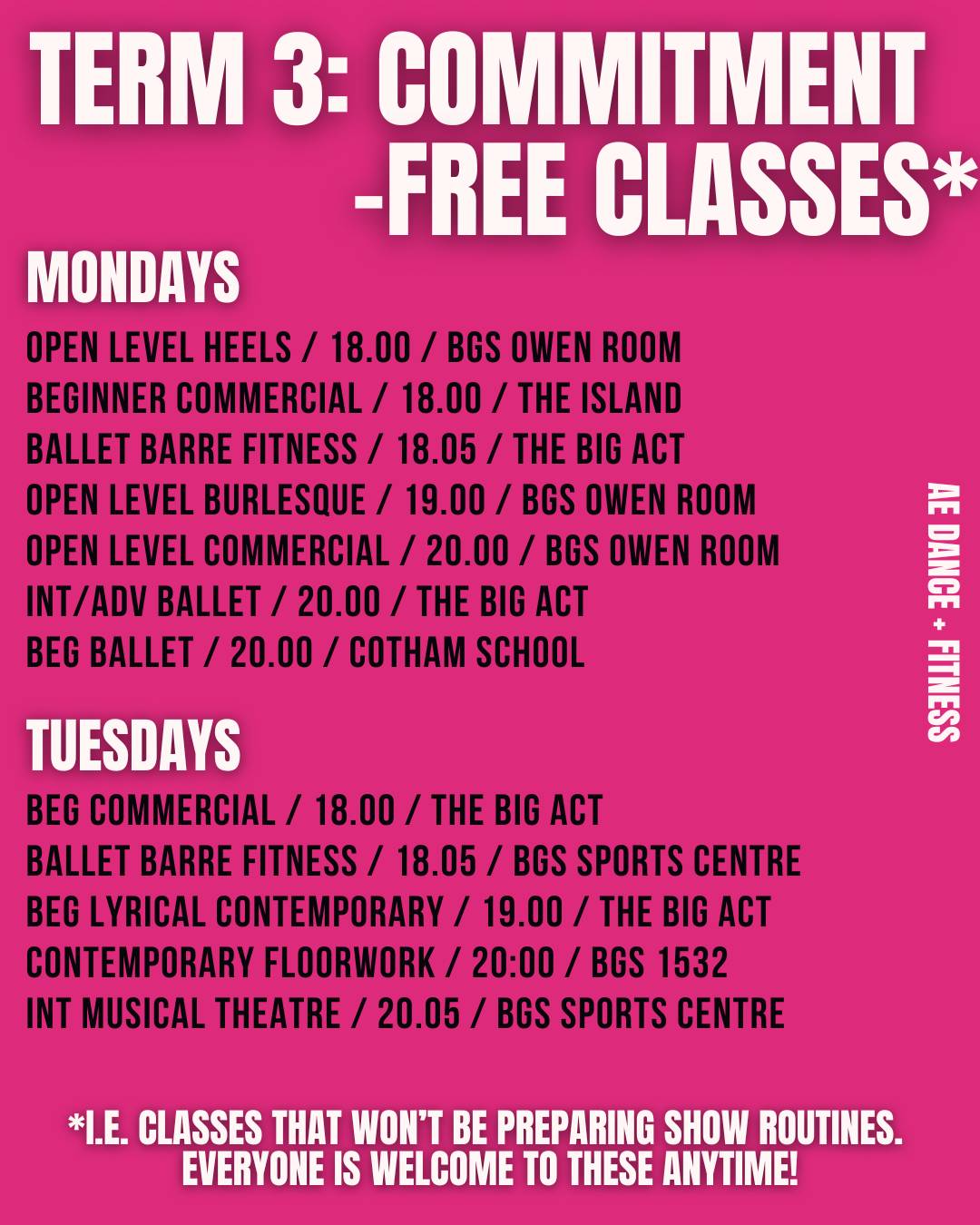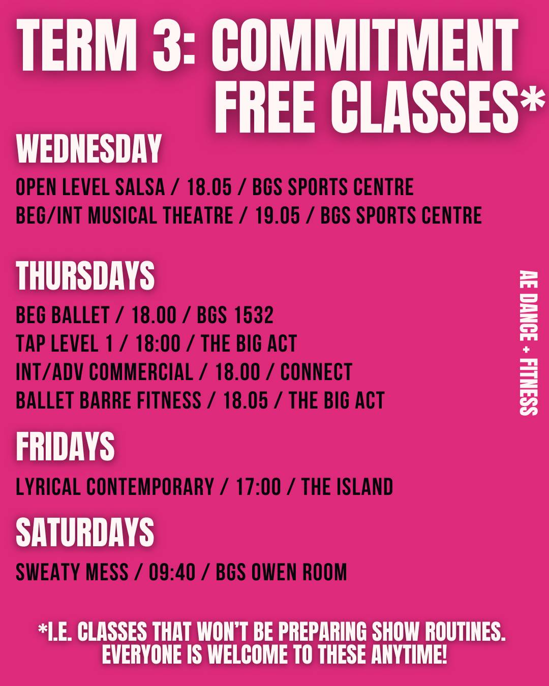 Commitment-Free ClassesIf you're reading this and thinking 'I absolutely DO NOT want to go anywhere near a class that's preparing for a show routine', please don't panic! We'll also be running Commitment-Free classes from April-June. These are classes that will run totally as normal, and will not be preparing show routines. You can see a full list below... On the booking site you can filter between Commitment-Free classes and Voulez Groove classes using the light blue filter buttons above the class schedule.