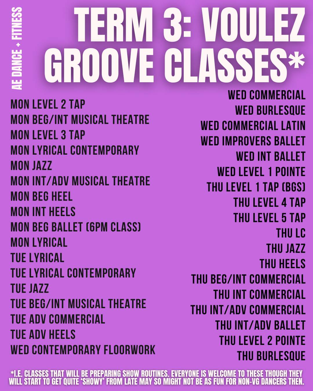 AE DANCE + FITNESSVoulez Groove 2026 - Explained!Voulez Groove is our BIG dance show coming up on Fri 19 and Sat 20 June 2026. Voulez Groove classesMost classes will prepare show pieces and perform - you can see which classes on the list below! But it is totally optional to perform! You are super welcome to come along to classes as normal even if you can't make Voulez Groove. Most classes will still run pretty much as normal until mid-May (just with slightly more focus on one routine, rather than changing each week). If you'd like to know when/if it's a good time to join a class, shoot us an email as each class will be at different stages in their show routine as the term goes on.