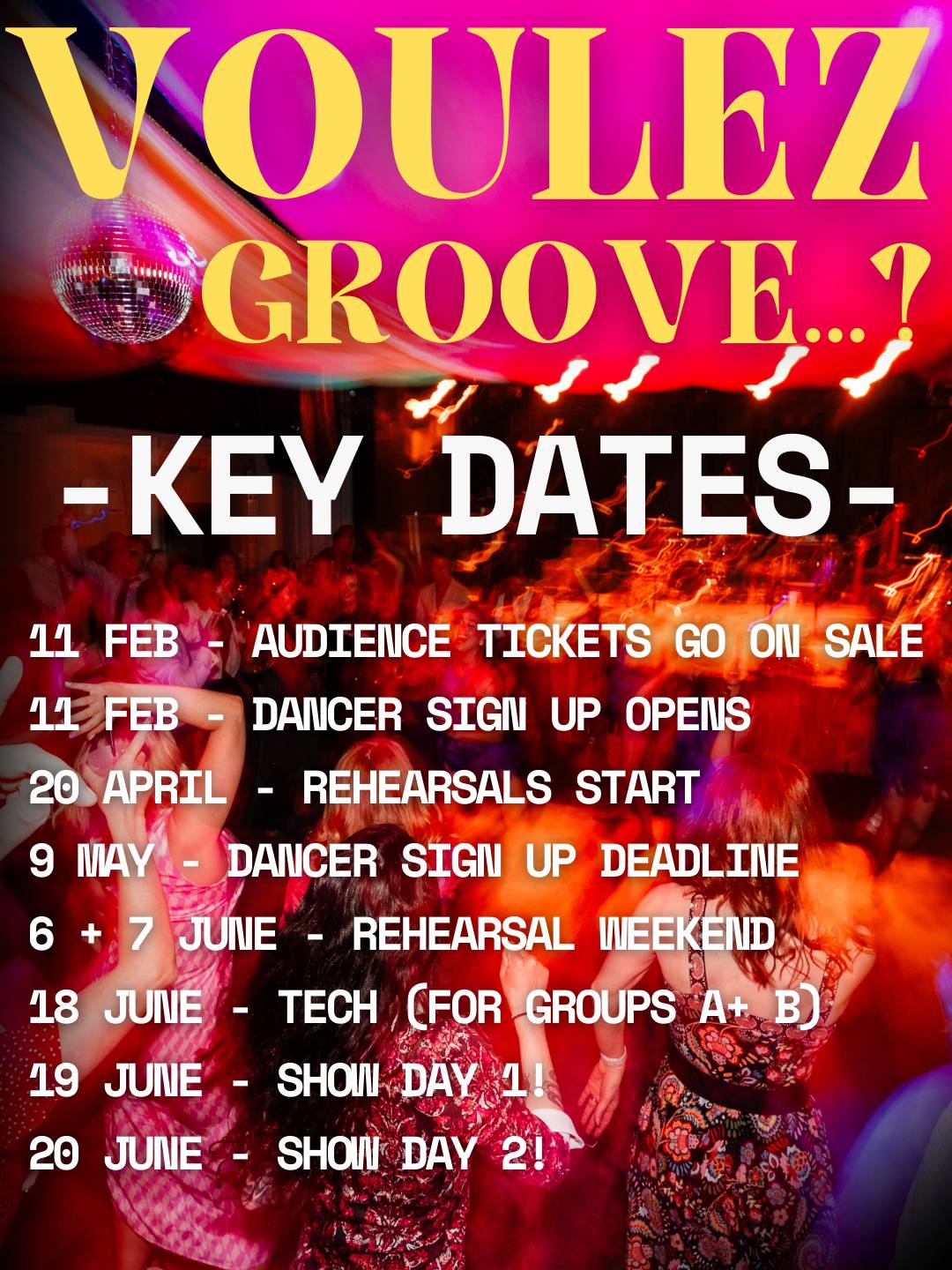 Signing up...To sign up to dance in Voulez Groove 2026 you need to do the following 3 things before 9 May (but ideally by the end of April)...